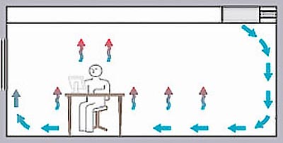 Den vridbara fronten riktar alltid tilluften så att luftutbredningen sker nedåt längs med bakväggen och ut längs med golvet. Då rumsluften stratifieras, behöver hela rumsvolymen inte kylas.